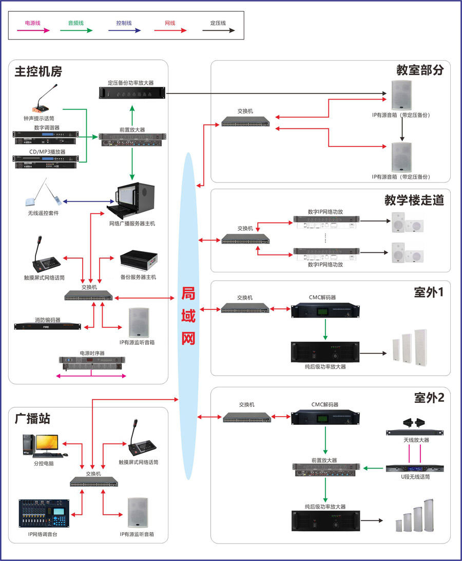 學(xué)校IP廣播系統(tǒng),主要根據(jù)學(xué)校不同年級(jí)上下課打鈴、學(xué)生播音、運(yùn)動(dòng)會(huì)等活動(dòng)、消防廣播,以及進(jìn)行英語(yǔ)聽力等需求而進(jìn)行設(shè)計(jì)的廣播系統(tǒng)。此系統(tǒng)可以進(jìn)行點(diǎn)對(duì)點(diǎn)廣播,實(shí)現(xiàn)不同分區(qū)播放不同背景音樂,同時(shí)教室終端音箱具有定壓備份功能,在進(jìn)行英語(yǔ)聽力的時(shí)候能夠保證考試的正常進(jìn)行,各個(gè)設(shè)備連接到廣播的局域網(wǎng)后就可以使用。