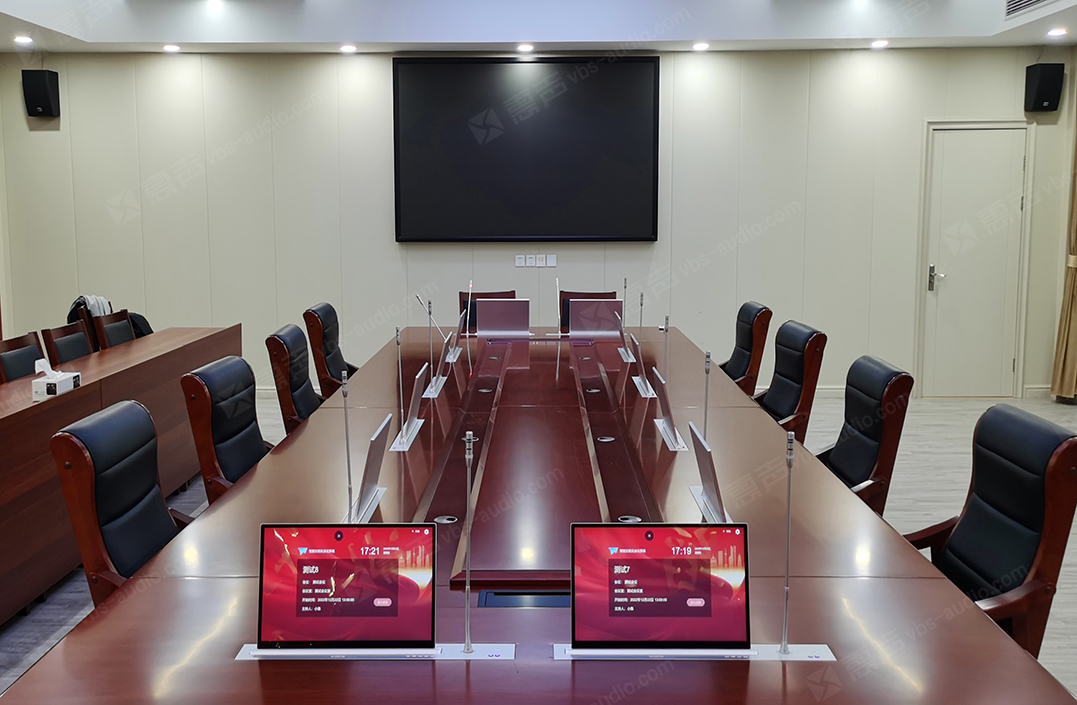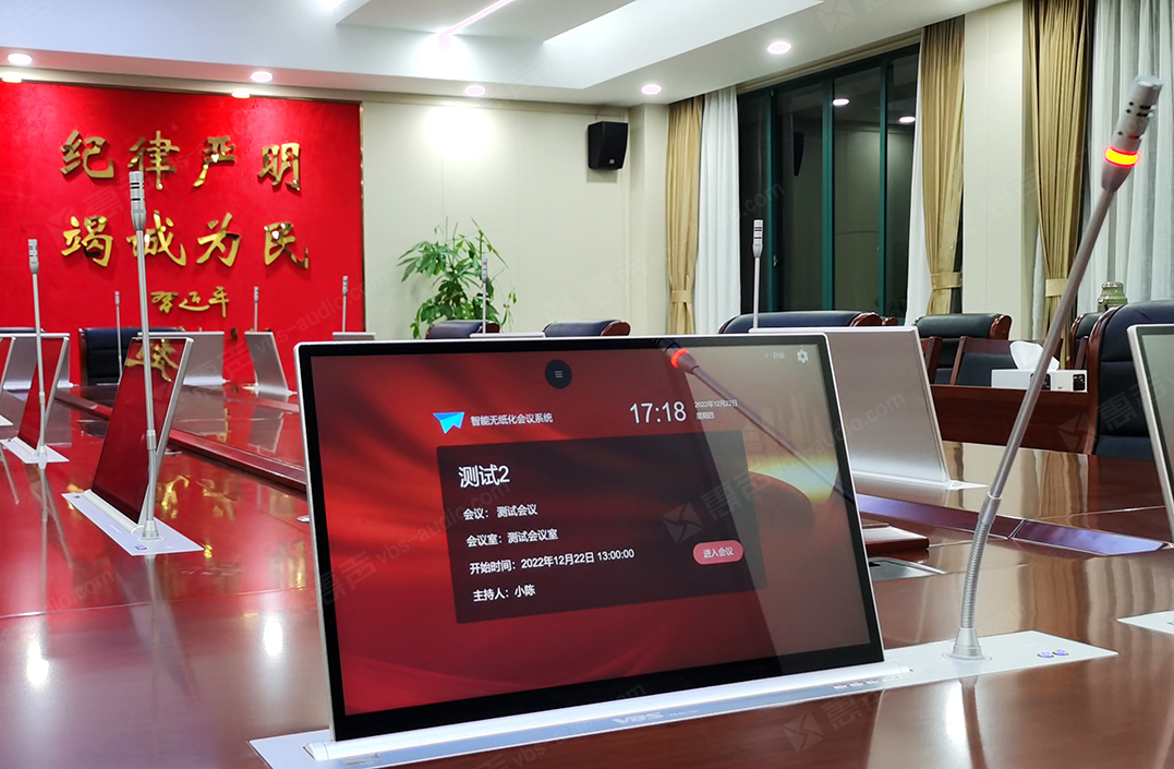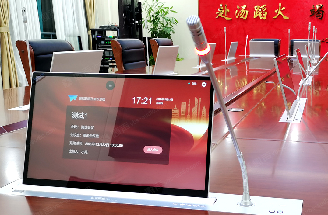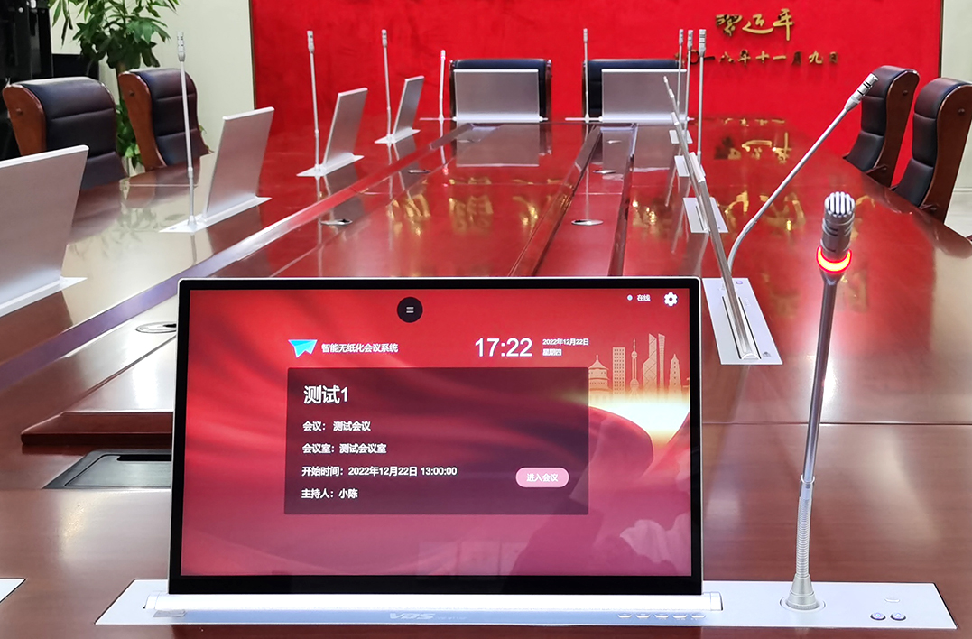 惠聲根據(jù)會議室的布局及使用需求,在會議室每個座位設計一臺15.6英寸升降式單屏帶話筒終端,屏幕與發(fā)言話筒可上升下降,與會議桌面平齊,達到方便且保持桌面整潔的效果。無紙化會議終端通過局域網(wǎng)絡與無紙化控制主機連接,組成一套完整的,具有智能交互功能的無紙化會議系統(tǒng)。系統(tǒng)全面支持會議投票表決、多媒體播放、Office文稿、上網(wǎng)、短消息通知等多項會務功能;集成同步文稿演示、電子白板、手寫批注、主持功能、共享到大屏等高級無紙化會議功能;支持后臺配置共享文檔、共享視頻供終端查閱播放。也可以一鍵切換到獨立查看文稿模式,具有組合型功能配置。覆蓋會前、會中、會后全部流程,支持多會議管理、支持多會議預設等功能。配合專業(yè)擴聲系統(tǒng),可很好滿足會議室的日常使用需求!