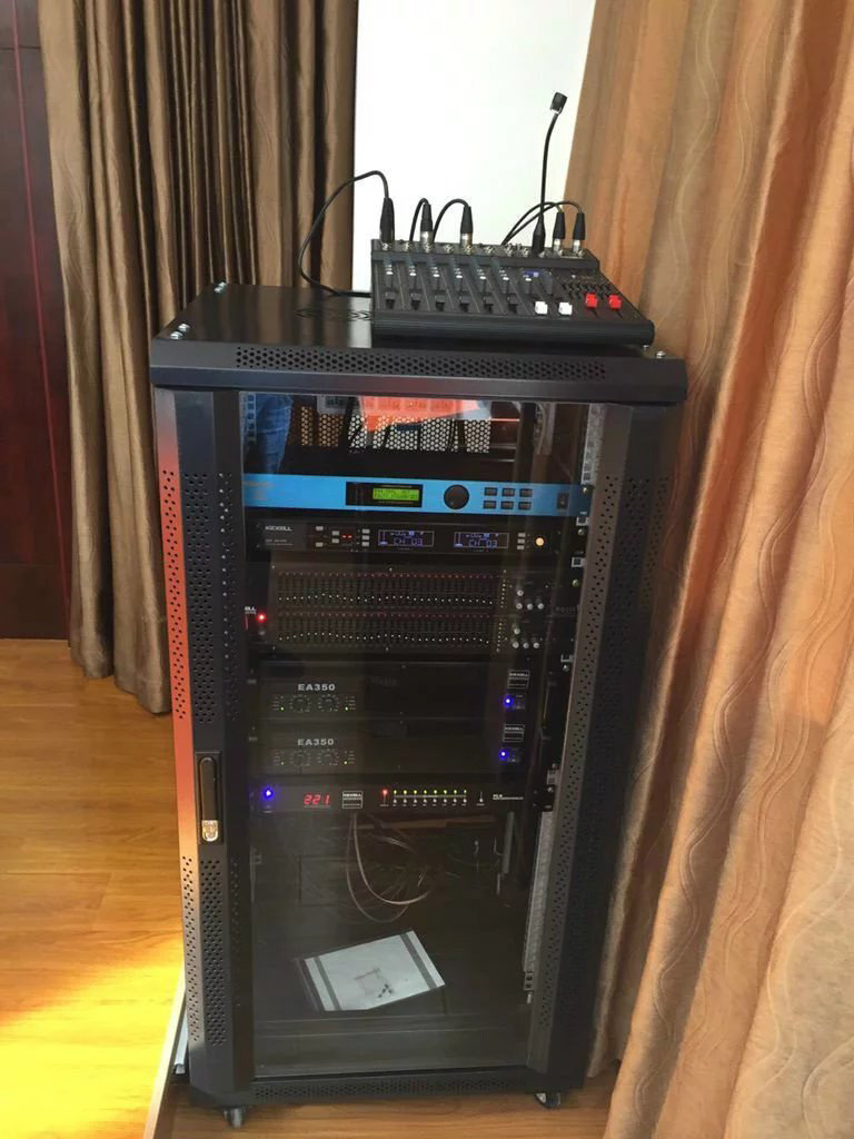 為滿足客戶需求,惠聲為此針對設計了一套專業(yè)擴聲會議系統(tǒng),在每個會議桌位置上配置一臺會議話筒,由調(diào)音臺進行管理控制,提供48V幻象供電。機房設計6調(diào)音臺,該款調(diào)音臺體積小巧,功能齊全,可放入機柜,具備藍牙模塊,客戶可以不用進入機房就可把手機的聲音通過擴聲系統(tǒng)播出;支持USB音源播放功能,客戶可通過電腦或手機連接到調(diào)音臺上直接播放音樂。配合音頻處理器、反饋抑制器、均衡器等周邊設備,對音源進行處理優(yōu)化,達到還原人聲、聲場清晰、音質(zhì)優(yōu)美的效果。