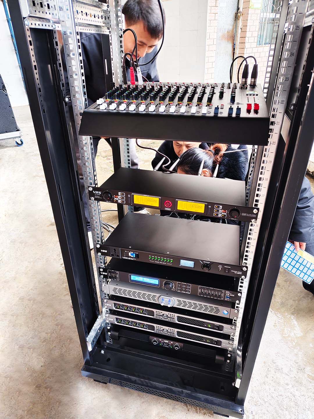 為滿足單位日常室外擴聲需求,惠聲專業(yè)設(shè)計全套數(shù)字會議系統(tǒng),音響采用線陣音箱1+4組合作為主擴聲,一對一定阻傳輸方式,音箱與功放阻抗匹配,采用全頻寬頻音箱,臨時舞臺上方兩側(cè)各一串。設(shè)計輔助環(huán)繞以及舞臺返聽,保證聲音輻射范圍全面覆蓋,做到美觀大方。調(diào)音臺采用了多路調(diào)音臺,麥克風選用VS-1302M真分集主機,配備手持、頭戴等多種類型可選。整套系統(tǒng)為學校舉辦大型運動會、培訓等活動提供了良好的會議擴聲環(huán)境。