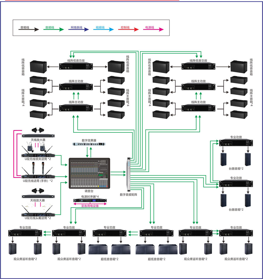 本套系統(tǒng)滿足整個(gè)觀眾看臺(tái)區(qū)域、體育比賽賽場的均勻擴(kuò)聲、聲音涵蓋區(qū)域聲場分布均勻、頻率響應(yīng)一致;體育館有時(shí)會(huì)涉及到各種體育賽事的現(xiàn)場直播與本地?cái)U(kuò)聲任務(wù),甚至有時(shí)還有相關(guān)媒體錄音以及消防安全信號(hào)插入,因此對系統(tǒng)的穩(wěn)定性、擴(kuò)展性、信號(hào)傳輸處理的質(zhì)量和準(zhǔn)確性要求非常高。
