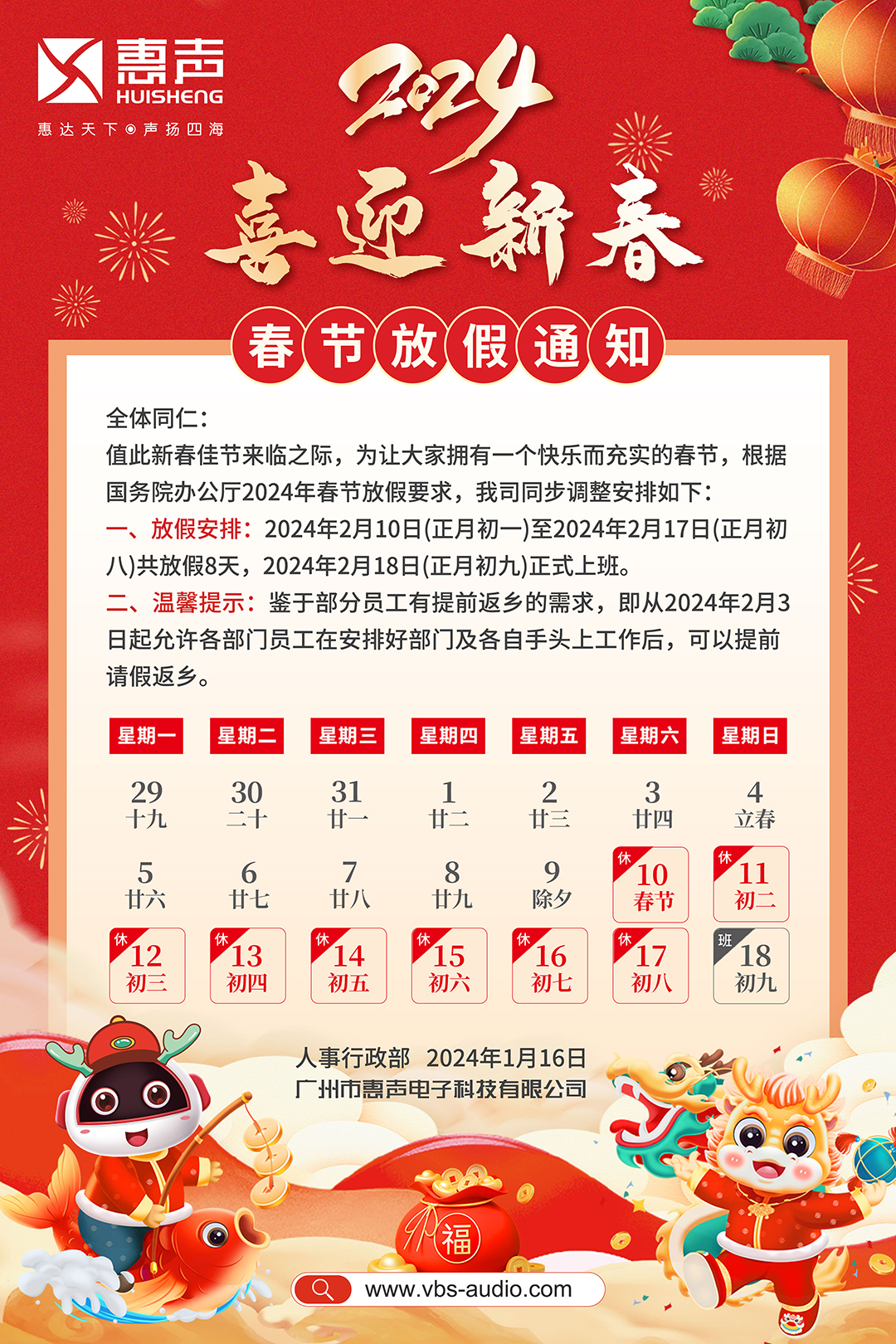 春節(jié)即將來(lái)臨,我司將于2024年2月3日至2024年2月17日期間暫停發(fā)貨、員工休假。也誠(chéng)摯感謝各界朋友與伙伴們一直以來(lái)對(duì)惠聲的支持與信賴!恭祝大家:龍年大吉、萬(wàn)事如意、龍騰虎躍、闔家安康!