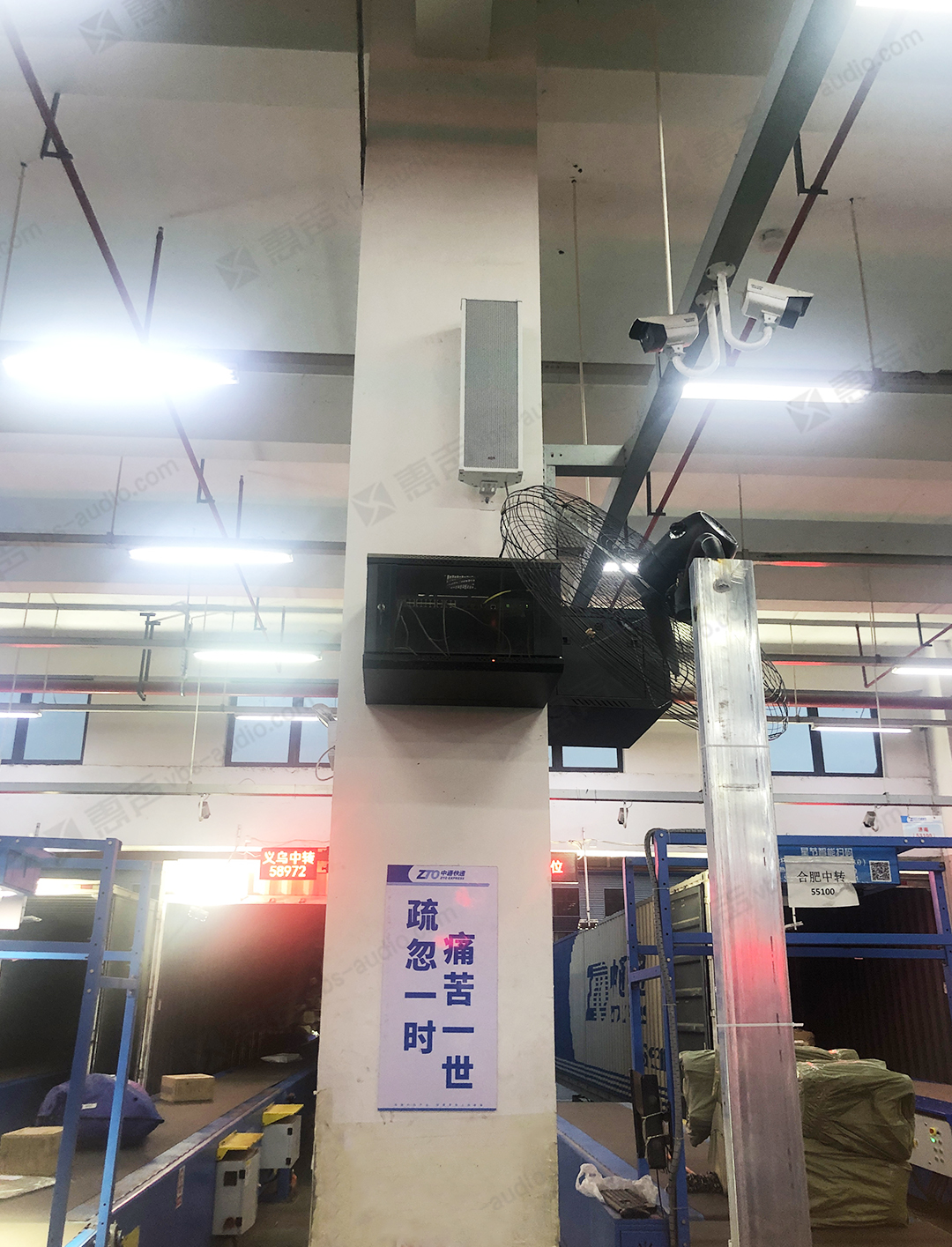廣州惠聲為中通快遞物流園量身設(shè)計了一套IP廣播系統(tǒng)。系統(tǒng)采用現(xiàn)有LAN/WAN網(wǎng)絡(luò)架構(gòu)建設(shè),具有同步廣播、分區(qū)廣播、終端廣播、設(shè)備控制、編輯程序、下載程序等功能。并且各路音源、電源管理器、報警方式、分區(qū)、終端等配置,均支持同網(wǎng)段局域網(wǎng)和跨網(wǎng)關(guān)局域網(wǎng)以及Internet網(wǎng)上運作,真正實現(xiàn)音頻廣播、視頻監(jiān)控、計算機網(wǎng)絡(luò)的多網(wǎng)合一!專業(yè)室外防水音柱和壁掛式音箱完成區(qū)域內(nèi)背景音樂全覆蓋。本次方案全方位滿足了管理中心園區(qū)背景音樂播放、廣播通知、緊急廣播、定時打鈴等要求。支持手機APP在線喊話,對所屬區(qū)域進行語音播報,喊話,安排工作等功能。