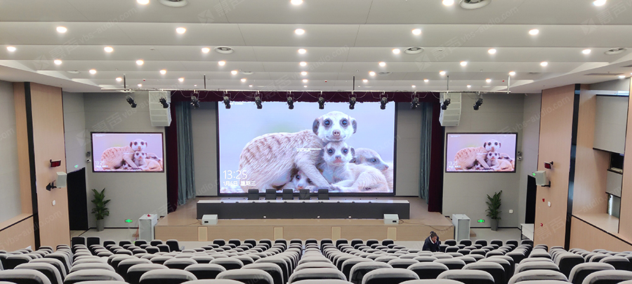 在1樓可容納500人報(bào)告廳內(nèi),配置2組4+1只10寸全頻專業(yè)線陣音箱作為主擴(kuò),4只12寸全頻專業(yè)音箱作為后場(chǎng)補(bǔ)聲,舞臺(tái)配置2個(gè)雙18寸重低音全頻音箱,2只12寸返聽,4只10寸臺(tái)唇,配備調(diào)音臺(tái)及周邊音頻處理設(shè)備,對(duì)聲音進(jìn)行處理。