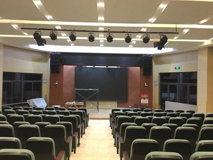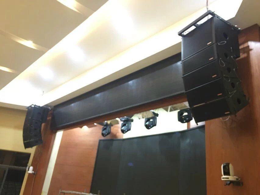 線陣音箱吊裝在報告廳的前面,面向整個觀眾席,有更高的指向性。