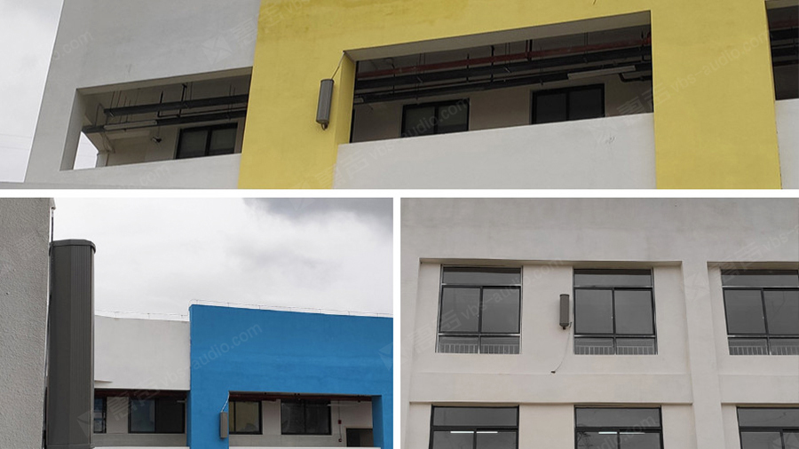 為了讓廣播的聲音輻射整個(gè)園區(qū),在幼兒園園區(qū)建筑外墻使用大功率防水音柱。