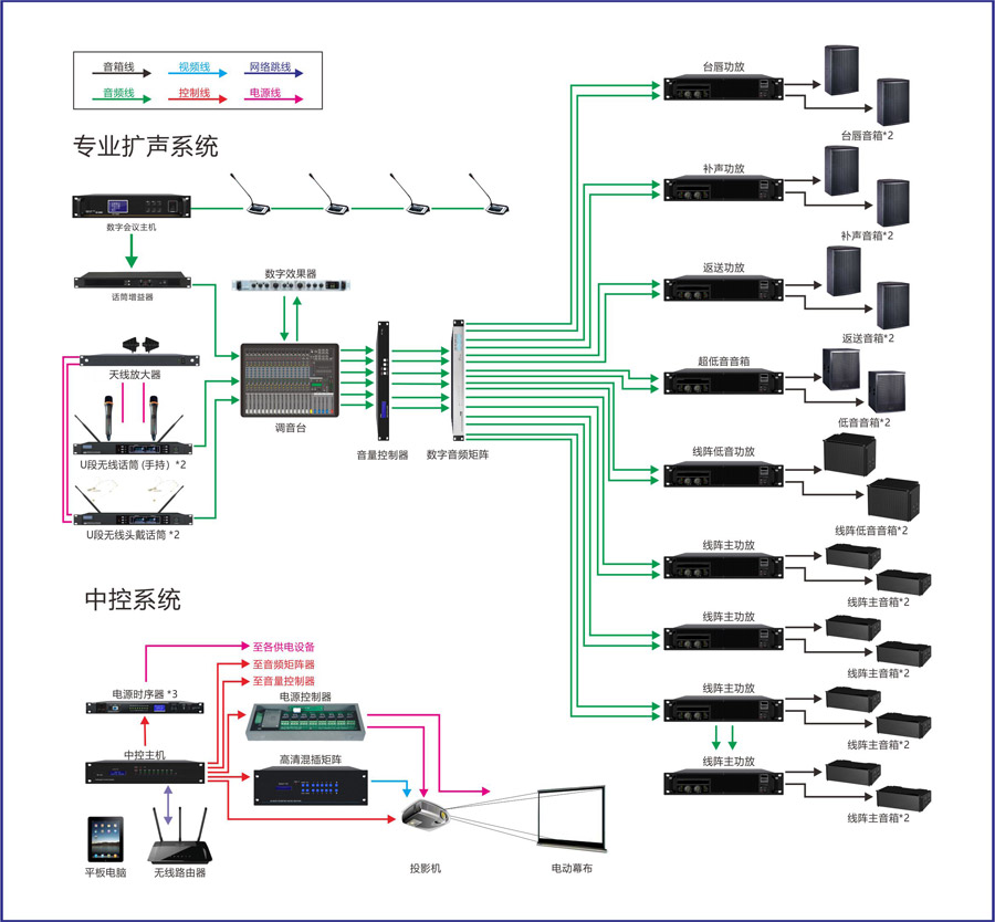 會(huì)議模式的多樣性——采用數(shù)字會(huì)議系統(tǒng)和數(shù)字周邊處理器,設(shè)計(jì)多種工作模式,如:會(huì)議模式,演出模式等等;